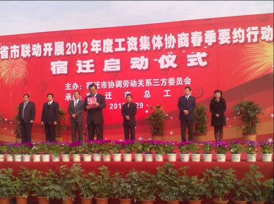 3月1日,江苏荣浩投资集团有限公司工会作为泗阳县唯一一家企业代表在市政府广场参加了宿迁市工资集体协商“春季要约”行动启动仪式。副市长赵深出席仪式并作了重要讲话。 赵副市长指出,落实好工资集体协商制度需要社会各界的共同努力。他要求各级工会组织、人社部门、经信部门、企业协会、商会及企业法人代表和市、县(区)协调劳动关系三方机制成员能够共同努力,努力做好我市工资集体协商工作,为宿迁市的经济和社会事业的和谐发展作出新的贡献。