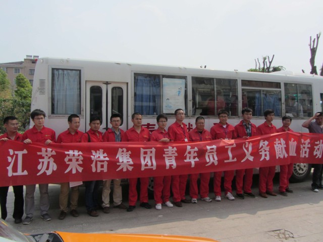 2012年5月8日,江苏荣浩投资集团有限公司团委组织30多名团员青年参加义务献血活动。 当天下午,炎炎烈日挡不住青年职工们奉献爱心的激情,大家陆续来到县人民医院爱心献血屋排队等候献血。青春的笑容,火红的服装,构成了奉献爱心的主旋律。“点点滴滴爱意浓,献血播洒荣浩情”是整个活动的真实写照,体现了荣浩青年友爱互助、关爱社会、关爱他人、乐于奉献的精神风貌。