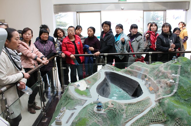 图三:为女职工参观座落在海拨928米山顶上的天池水电工程模型以及天池景区。