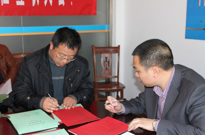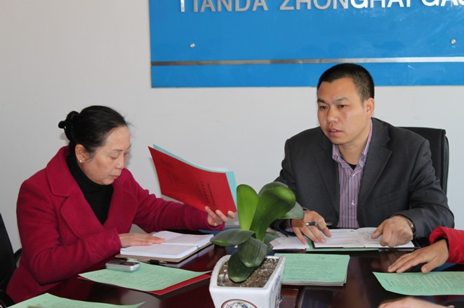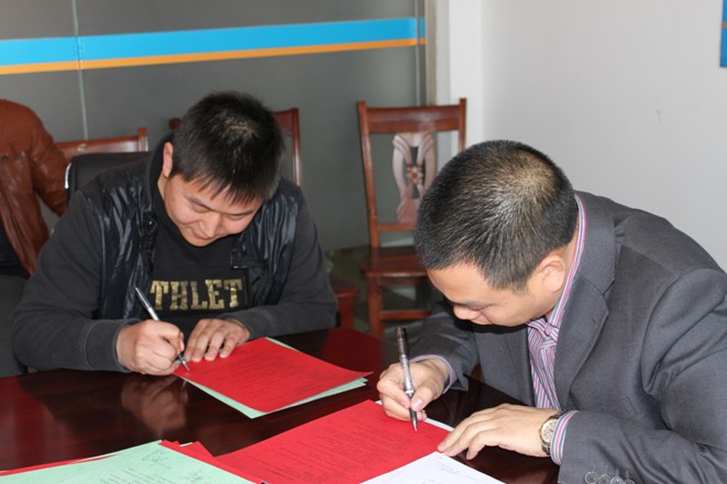 图三:为公司总经理潘建远分别与各部门负责人签订工作目标和安全目标责任书,图为与市场发展部和财务管理部签订责任书场景。