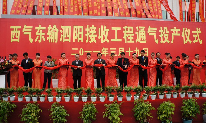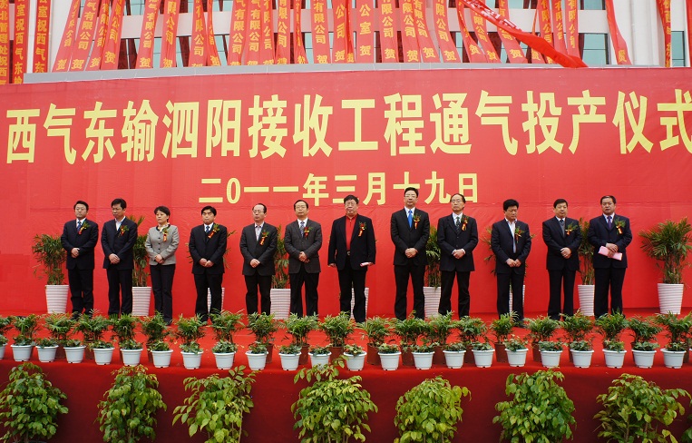 3月19日上午,江苏荣浩投资有限公司西气东输泗阳接收工程正式通气投产。泗阳县委书记赵深,县委副书记、县长李荣锦,县人大常委会主任何平,县政协主席陈富胜,西气东输管道(销售)公司总经理助理李世泉,美国美银基金大中华区总裁、江苏省中小企业协会常务副会长陆晓平,县委常委、县政法委书记王业珍,县委常委、县纪委书记庄国波,县委常委、县组织部长刘士武,县委常委夏养育,县委常委众兴镇党委书记马伟,江苏荣浩投资有限公司总经理、泗阳荣浩管输天然气有限公司董事长余义伟等出席投产仪式并为通气投产剪彩。与会嘉宾还有县人大副主任王民,县人大副主任吴玉华,县人大副主任葛习和,副县长王新明,副县长王家锋,副县长刘娟,副县长毛峰,副县长赵居伦,县政协副主席刘厚华,县政协副主席张业修及部分县直属机关领导、企业家代表等参加投产仪式。仪式由县委常委、泗阳经济开发区党工委书记郑干先主持。